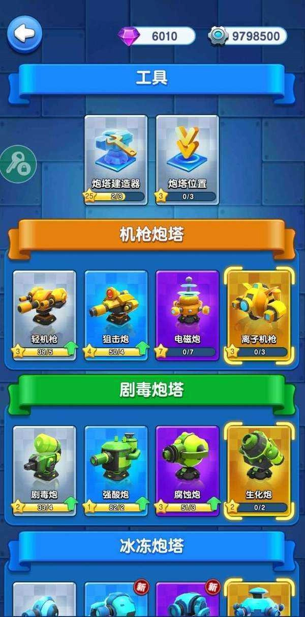 最后提一下,通过看广告开启500箱子获得的炮台建筑器先留着。在正常能打得过的情况下,3个boss可以用来升2级炮台。要是遇到怪物打不过或者打得很费劲,这时候炮台建筑器就能拿来应急。我发现,打完一个地图切换到下一个地图时,怪物的强度会突然变强或者变弱。卡小怪就用第3个炮台的第四阶,打boss也用第3个。另外,关于金色卡片,我感觉只要不升级,似乎获得的数量会多一些。当然不是一直都多,只是给没升级的那个卡片的几率会大一点。我一开始有3个没升级,到最后只有离子机枪没升级,其他的没办法,必须得用。