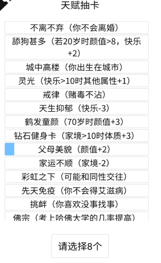2、随机获取起始属性,例如天赋、体质、家境、智力、美貌等不同的属性设定。