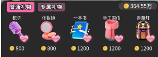普通礼物:会随着自动养成等级逐步解锁,可用金钱购买。赠送此类礼物后,好感提升值为当前好感提升值乘以礼物对应的提升数值。