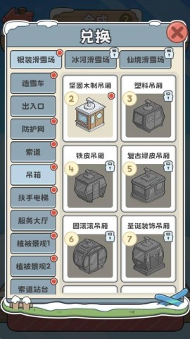 轻触右下角的兑换按键,琳琅满目的装饰品便在此静候,助力你打造一个绚丽多彩的滑雪场!
