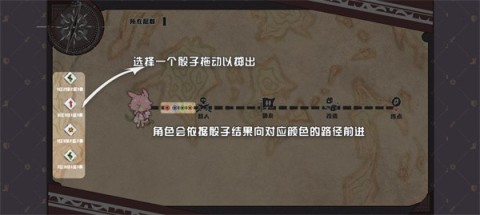 2. 玩家通过拖动一个骰子进行投掷操作,角色将依据投掷结果选择相应颜色的路径向前行进。