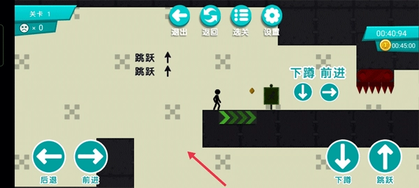 1. 打开游戏后,映入眼帘的仅有一个按钮,点击“开始游戏”。此时,仅关卡1处于解锁状态,点击关卡1即可开启游戏。接下来介绍火柴人挑战的基本功能按键:左边是简单的后退与前进按钮,右边则是下蹲和跳跃按钮。着重讲讲上面中间的功能,“返回”的作用是,当你陷入某个无法通过的陷阱时,点击它就能回到游戏起始场景;“选关”可让你重新挑选开始游戏的关卡;“设置”仅有音响和声音这两种设置选项。右边显示数字之处,代表着你通关所需时间以及获取金币数量的目标。