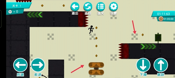 5、此时你会瞧见这种带有两个箭头杆的陷阱,倘若此刻你想获取金币,就得用到【后退】、【前进】、【跳跃】这三个按钮,方可触碰到金币。