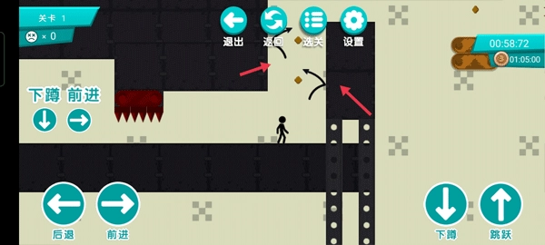 4、另外,当刺出现在火柴人上方时,同时按下【前进】与【下蹲】这两个按钮,便可迅速通过该刺。