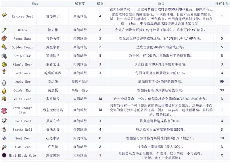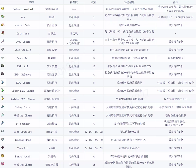 游戏中的道具主要分为携带道具、持有道具(重要道具)以及消耗品这三大类。进一步细分的话,还包括树果、努力药等。接下来,会针对每一类中较为关键的新物品以及有变动的原版物品展开详细介绍。