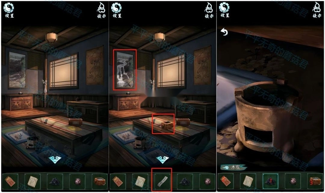六、接着用钥匙打开茶房,点击第一张图里屏风所在位置,获取密码【3957】,此密码可打开下图柜子,进而得到木炭。之后点击中间图的图片位置,输入密码【左右左左右左】,解开福字门锁,拿到【茶宠】。茶宠需放置在倒满水的杯子里。