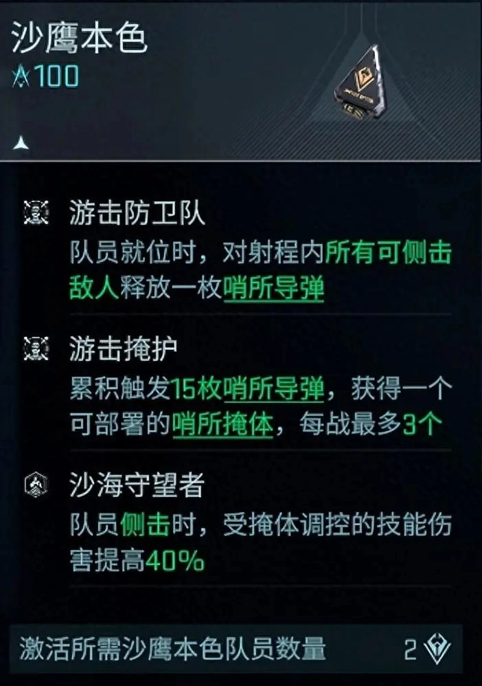 沙鹰是非常实用的战术模组,其核心在于如何在队员有效射程内打出更多侧击,以最大化伤害。在上阵队员射程内,每个被侧击的敌方都会受到一颗导弹伤害,累计触发15次还可获得可部署的掩体。