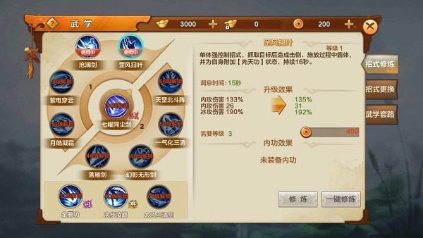 内功修炼需要在两个内功中进行选择,每个内功都有着不同的效果和属性加成,可以根据你的需求来随时进行变换。这个一般来说就是对PK中的情景进行细化的东西了,譬如你想增加速度还是防御,都可以通过心法来进行微调。
