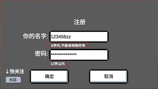 3、请输入一个名字与密码。需注意,名字长度应在6个字符以内,且不得包含特殊符号;密码长度应在12个字以内。