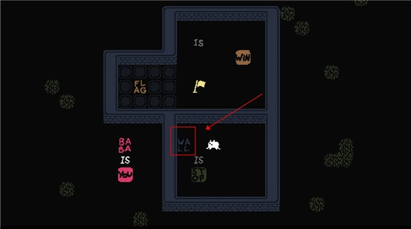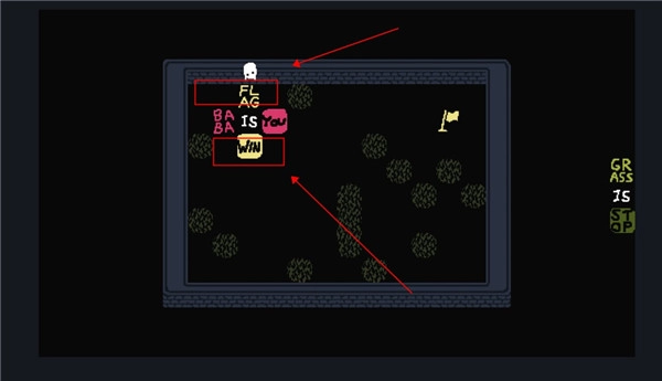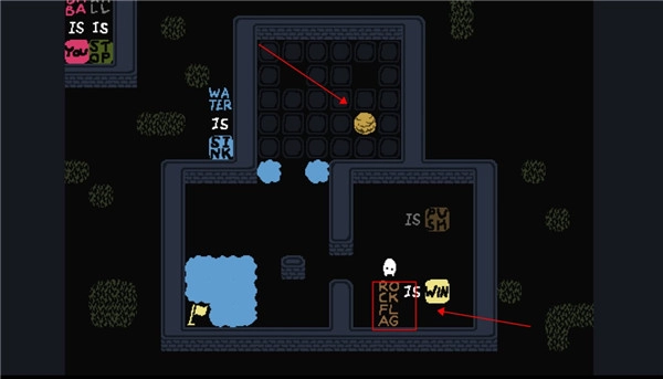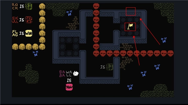 4、更改一下过关条件,让它变成“rock is win”,你便可以不再理会那个旗子。直接触碰石头即可过关。