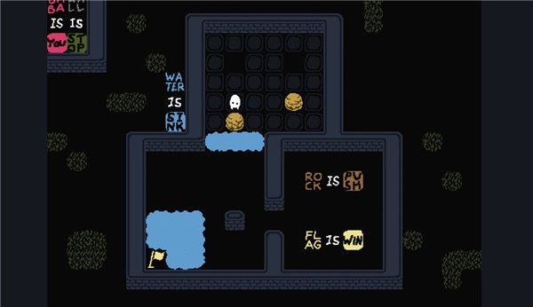 2、后来你能看到有关这个“规则”的各种变种,比如双层地图、用箱子填坑、单纯推出通路等等,场景中“baba is you”、“rock is push”、“flag is win”这些句子其实就是当前关卡的一个规则设定。