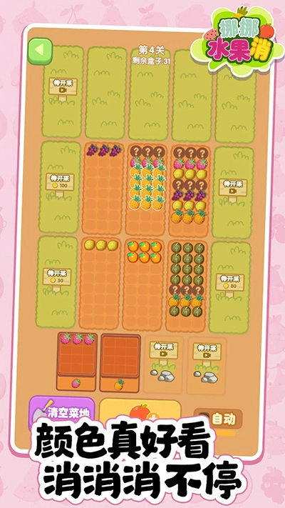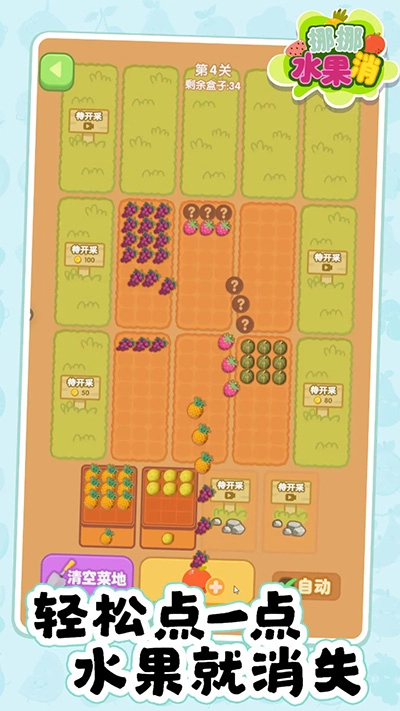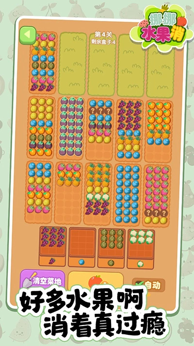 挪挪水果消是一款超有趣的水果消除小游戏,它有着清新可爱的独特画风,里面的水果蔬菜色彩鲜艳夺目。在游戏中,玩家要先种植这些作物,接着收集起来拿去卖钱。这款游戏玩法相当简单,玩家只需把水果蔬菜分类整理好,再放进对应的篮子就行啦。那些已经收集好的水果会马上兑换成金币,而金币能够用来开垦新的菜地。游戏里设置了大量关卡,随着游戏逐步推进,越往后的关卡对玩家的挑战就越大哟。感兴趣的小伙伴,赶紧来当快软件畅玩一番吧!