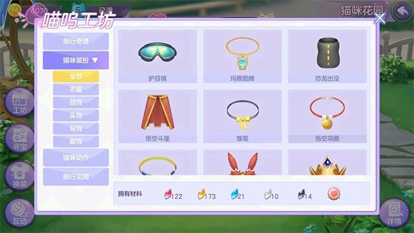 有些装扮需玩家在「喵呜工坊」制作,每只猫咪都有专属服饰。购买的装饰会收入「喵橱」,还能切换不同动作进行搭配展示,为喵星人打造独特造型,展现它们别样的可爱模样!