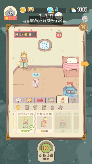 在房间菜单里,家贷等同于租金,能够依据满足度进行调整。家具栏设有四排,每个格子对应不同的家具类型,点击之后,可选择更换、购买或者出售原有的家具。