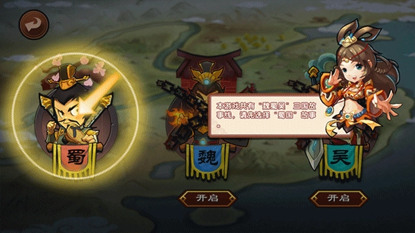 2、本游戏共有“魏蜀吴”三国故事线。请先选择“蜀国”故事,其他的后续解锁。 (原文本“游叛戏”疑似“游戏”的错别字,“昌国”疑似“三国”的错别字,已修正。)