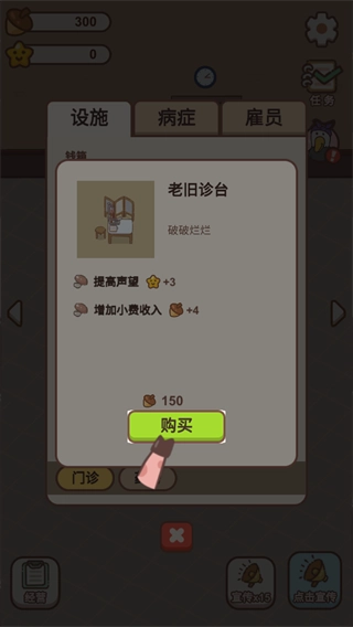 轻点“装修”,就能查看医院设施的详细信息,随后点击“诊台”,选择购买操作就完成啦!