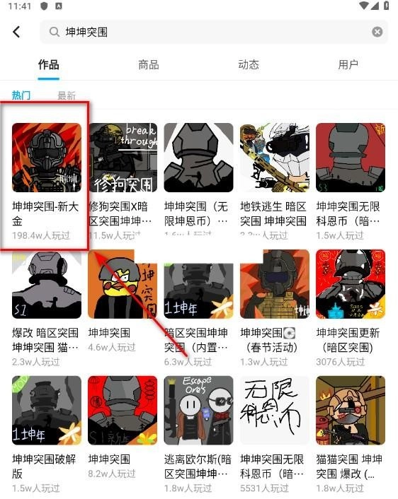 3、于创游世界的搜索框里输入“坤坤突围”进行搜索,届时会呈现出多个版本,玩家可从中挑选。