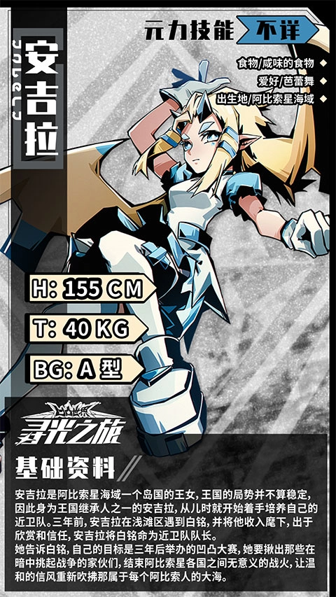 安吉拉,是阿比索星海域某个岛国的王女。彼时,王国局势并不安稳,身为王国继承人之一的安吉拉,自儿时起便着手培养自己的近卫队。三年前,安吉拉在浅滩区域邂逅白铭,随后将其纳入自己阵营。出于对他的欣赏与信任,安吉拉任命白铭为近卫队队长。
