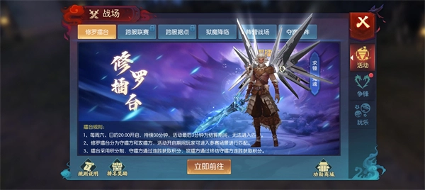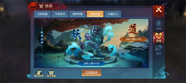 3、战场设有妖法传承与道法传承这两个场景。在活动期间,玩家能够依据自身喜好,任选一个场景进入。在活动过程中,玩家还可以随时退出当前场景并切换至另一场景,且积分会持续保留。