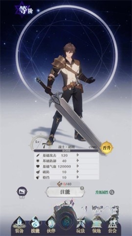 4、点击左下方的巨剑按钮,能够对角色进行升级操作。每次升级所需消耗的经验值各不相同,当角色积累的经验使等级达到一定程度时,便可实现晋升。