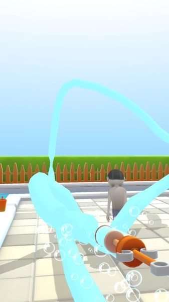 1. 场景中到处都是毫无生气的小人,拿起水枪,先熟悉一下喷射的操作,接着对准身旁那些沾满泡沫的角色喷水,待他们清洁干净后,便可加入派对。