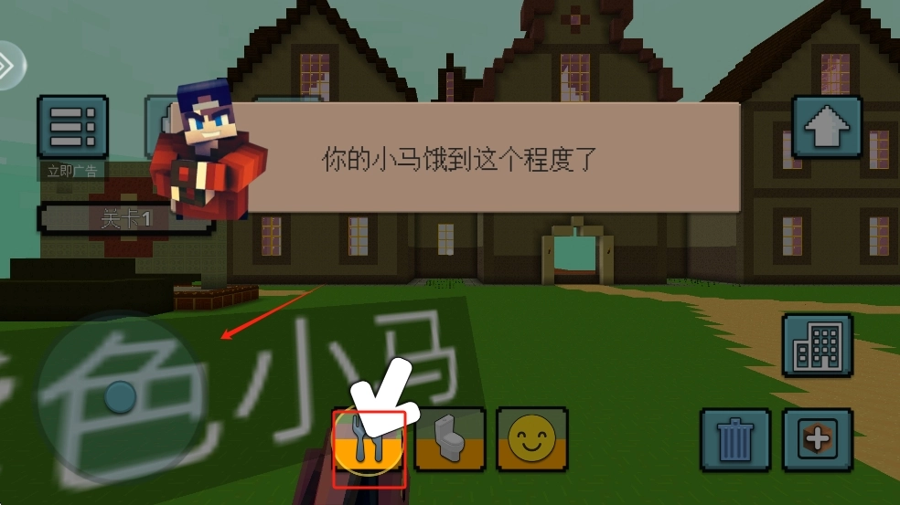 2、踏入关卡1的场景,当出现“你的小马饿到这个程度了”的提示后,点击下方带有餐具的黄色按钮,着手给小马喂食。