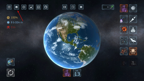 3、轻点右上角的眼睛图标,接着选取地球图案,如此就能成功解锁如来神掌。瞬间释放出如火焰般具有毁灭性的力量,大幅提升你的破坏指数!