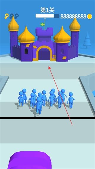 3、继续前行,沿途召集蓝色小人,扩充队伍规模,携手向着紫色城堡迈进。