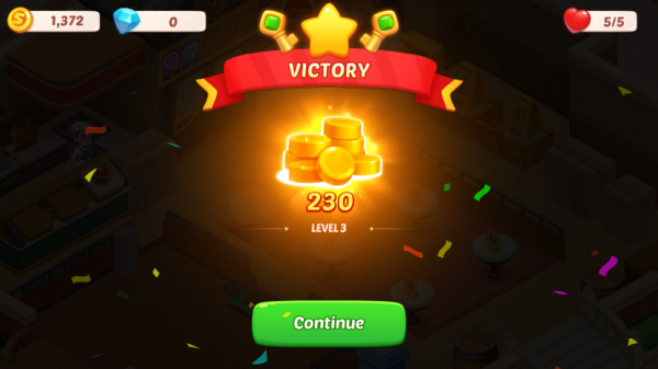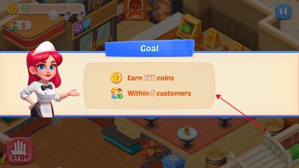 2、以这一关为例,要服务好五位客人,并且获取到144枚金币,才能达成满星通关。