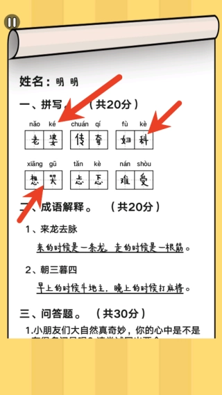 1、当你进入关卡,系统将展示一份完整的小学生语文试卷,交由你进行审阅。
