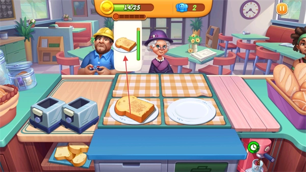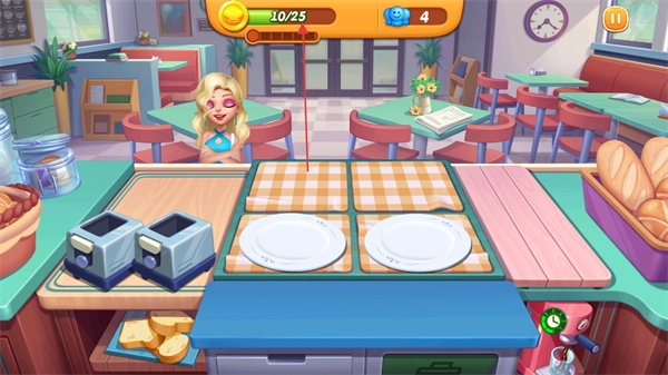 1. 开启游戏后,查看屏幕上方显示的金币目标,如10/25 ,以及顾客情绪值,例如4 ,同时留意顾客的需求。