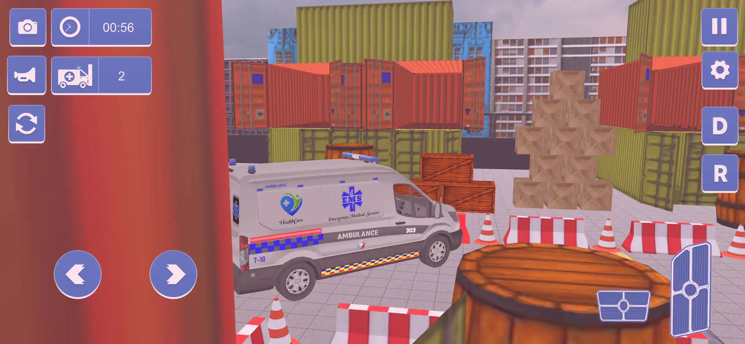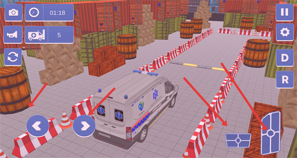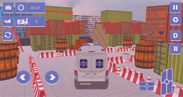 3、在限定时间内,玩家需操控救护车在集装箱区域行驶,借助喇叭警示以及重置按钮纠错,从而顺利抵达终点,完成任务。