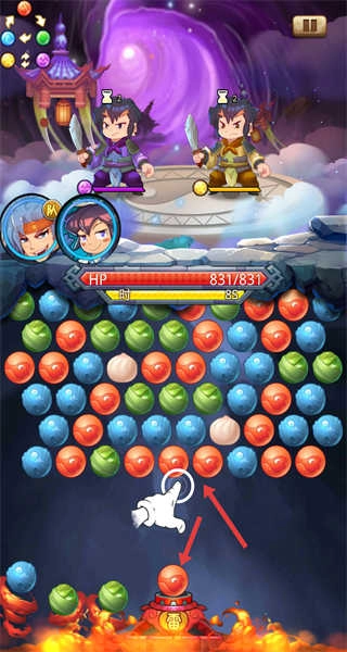 2、踏入游戏战斗界面后,瞄准同色泡泡进行发射,消除泡泡能够对敌人造成伤害。在此过程中,要留意角色的HP值,合理制定消除策略。