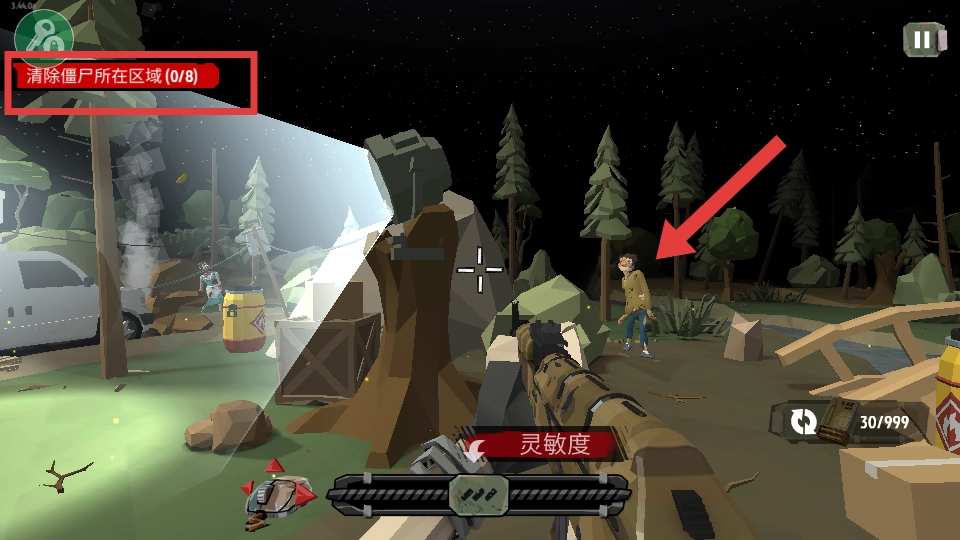 1. 依照【清除僵尸所在区域 - 0/8】任务的提示,运用枪械对场景里的僵尸展开攻击,依次把8个区域的僵尸清理完毕。