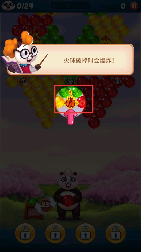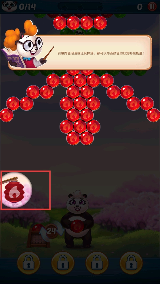 3、轻点灯笼,激活火球,借助火球消除众多泡泡,争取高分,顺利通关。