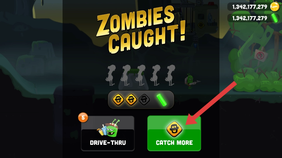 4、成功捕获僵尸后,点击【CATCH - MORE】按钮,便可继续捕获更多僵尸,达成关卡目标进而获取资源奖励。