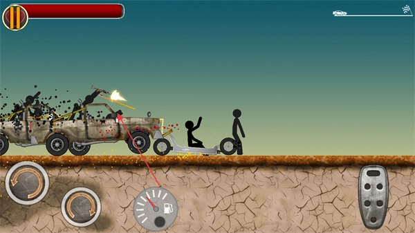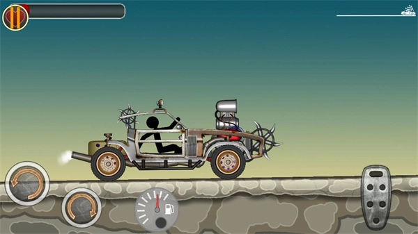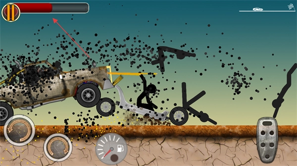 1. 来到游戏界面,通过屏幕右侧的按钮来操控火柴人所驾驶的车辆,同时要留意上方的血条。