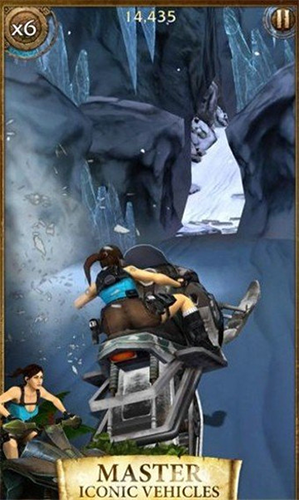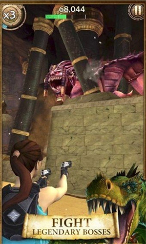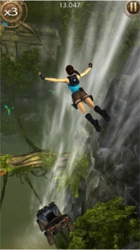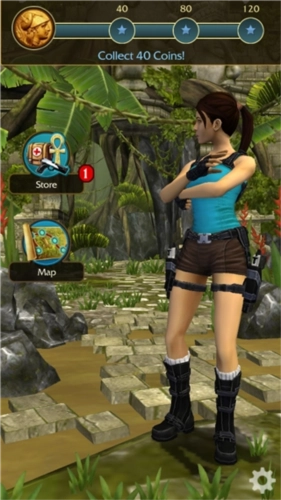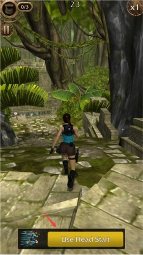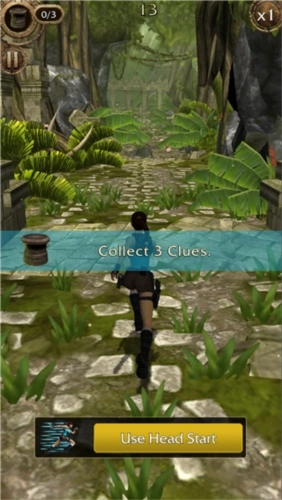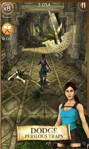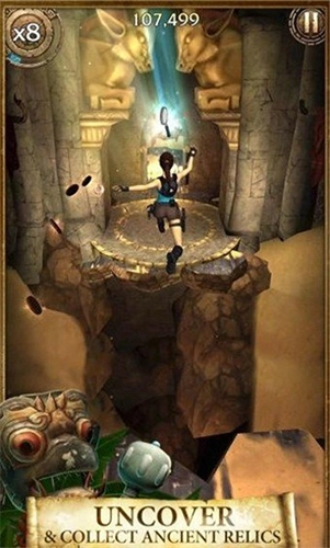 2、依旧是通过上下左右划屏,操控劳拉在遗迹中飞速奔跑,一边躲避陷阱,一边沿途收集考古道具。
