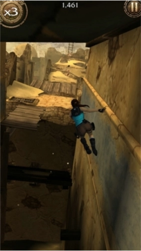 4、当处于左右两侧墙壁时,玩家需攀爬墙壁,此时务必留意自身移动方向。先移动至两侧位置,接着向左或向右滑动屏幕,让劳拉展现飞檐走壁的身手。
