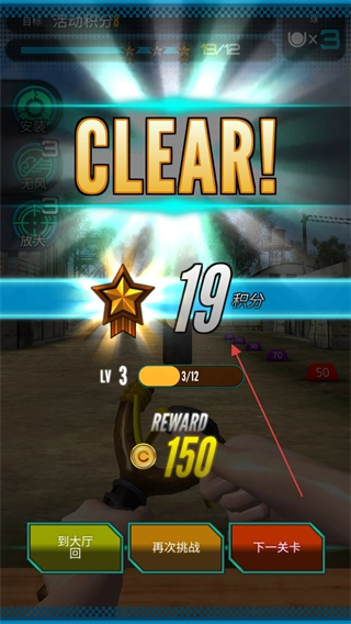 4、完成射击后,如果屏幕显示“CLEAR!”,请查看所获得的总积分与奖励,随后可选择进入下一关卡继续挑战。