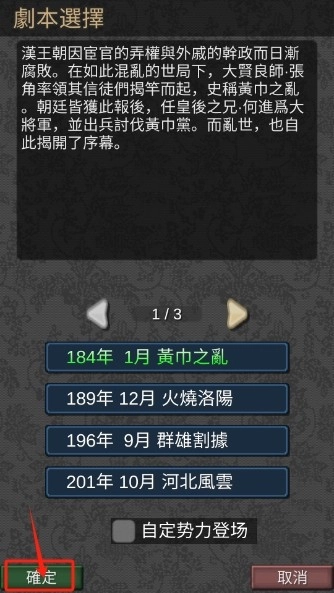 3、点击进入第一个剧本“黄巾和那南汉”。只有勾选自定势力登场,才能游玩自己创建的武将。