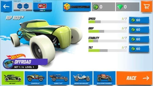 3、此界面展示了我们即将驾驶的赛车,点击下方的赛车图片就能实现切换,还能在右侧进行升级。一切准备妥当后,点击右下角的【RACE】按钮。