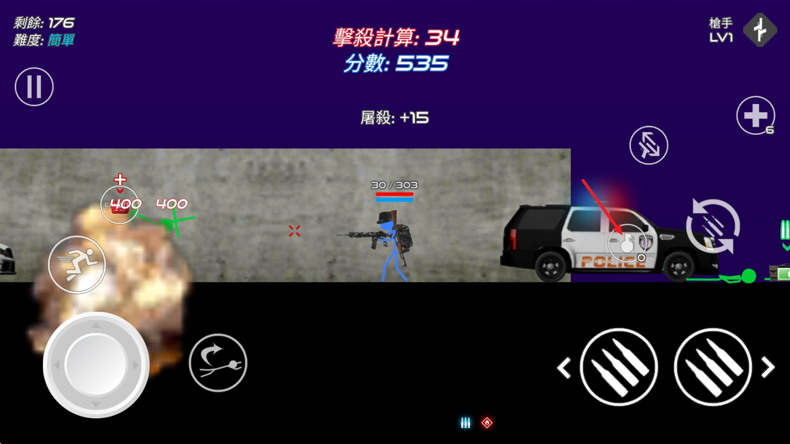 游戏里的按键设计十分经典,玩家屏幕左侧的按键用于控制角色左右移动,连续点击两次还能触发扑越动作来躲避子弹。