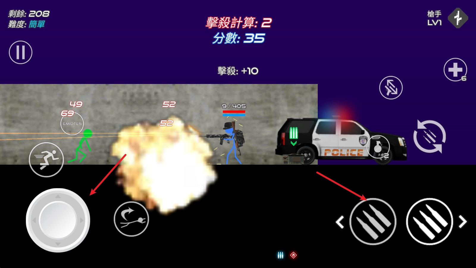 进入游戏后,左侧的摇杆用于操控角色移动,右侧设有左右两个开枪按钮,左边的按钮对应向左射击,右边的按钮对应向右射击。