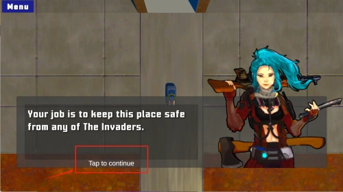 游戏启动后,点击“Tap to continue”即可进入主界面,此时留意蓝发角色身旁的任务提示“守护地点免受入侵者侵扰”,以此明确游戏的基础目标。