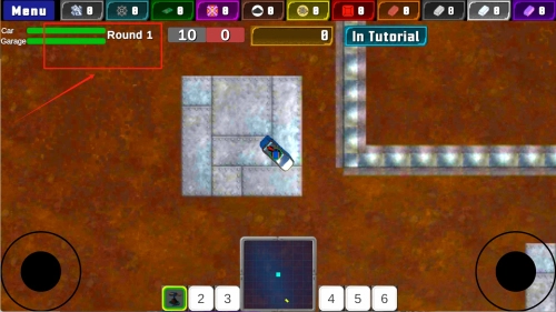 在第三张图的方格场地里,你可以用底部的数字键1到6来挑选武器或者道具,然后借助左右两边的圆形操控区域来驾驶车辆,让它沿着亮线的区域移动,以此完成第一轮的教程任务。
