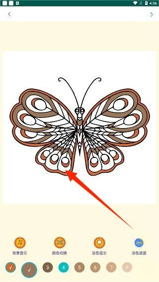 在绘画界面中,挑选心仪的色彩,轻点蝴蝶的线条范围,为其染上色彩,创造出别具一格的视觉效果。