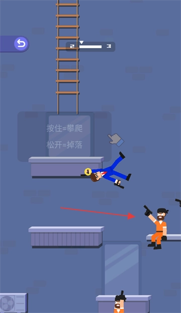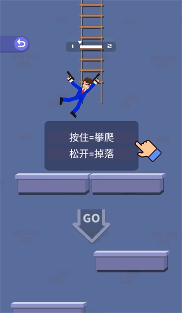 游戏开始时,按照提示【按住=攀爬 松开=掉落】,通过长按屏幕来操控角色攀爬梯子。