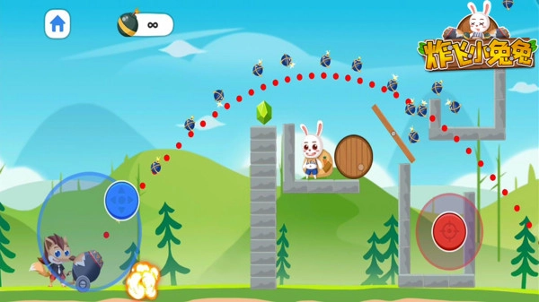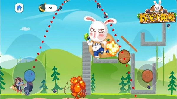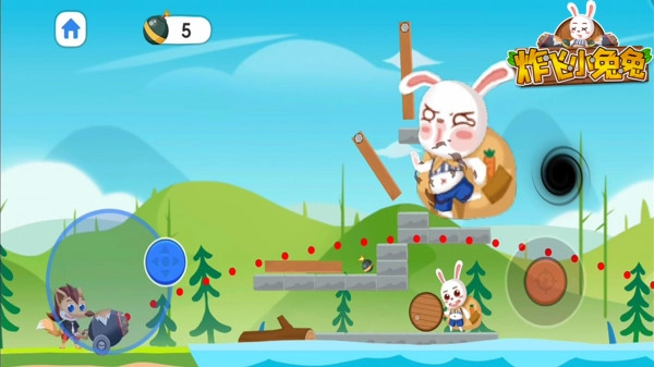 炸飞小兔兔的玩法和愤怒的小鸟类似,操作简单又好玩,玩家得控制小狼去射击小兔子。