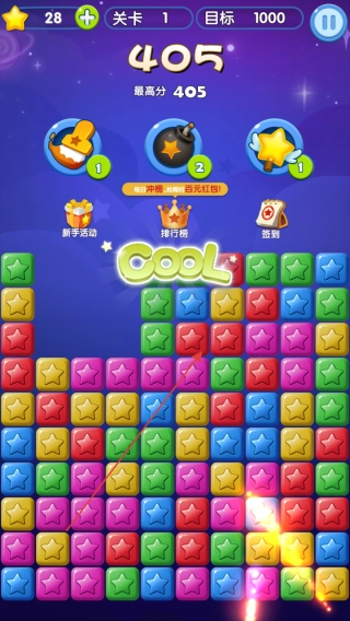 进入第一关后,请留意彩色星星的分布情况,点击相邻的相同颜色星星进行消除,通过积累分数来挑战目标。